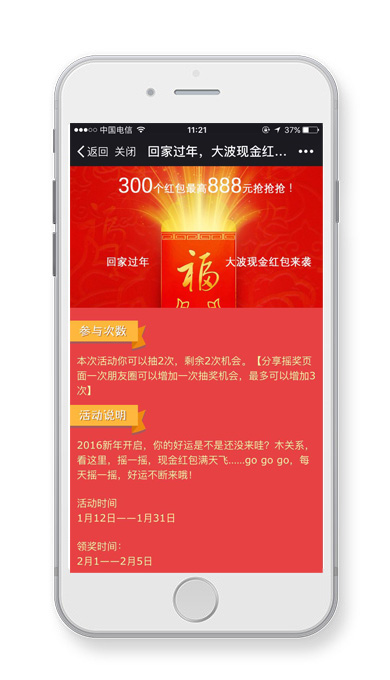 海亮微信平臺在2016年春節(jié)前舉辦的搖一搖抽獎活動,300個紅包最高888元,贏得了眾多粉絲的參與和新增粉絲,呼搜網(wǎng)為海亮微信公眾號提供技術(shù)支持和平臺搭建。