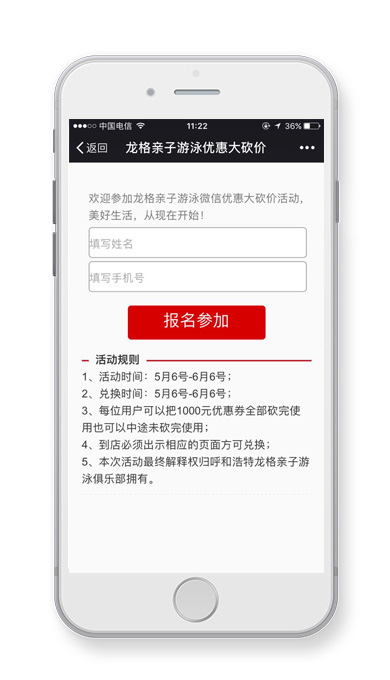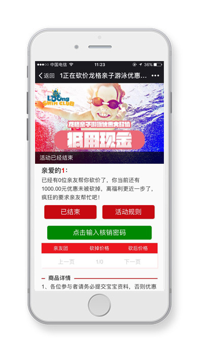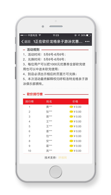 龍格親子游泳呼和浩特中心微信平臺舉辦的五一活動,代金卷微砍價。呼搜網(wǎng)為龍格親子游泳呼和浩特中心提供活動策劃、微網(wǎng)站開發(fā)、微信支付、支付寶支付、店內(nèi)卡卷消費、搖紅包、投票活動等一系列活動,為該店鋪帶來了諸多線下客戶。