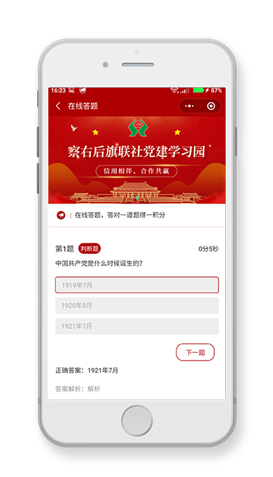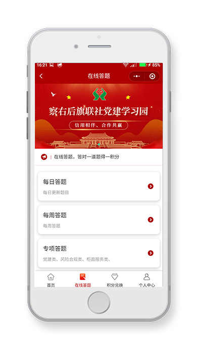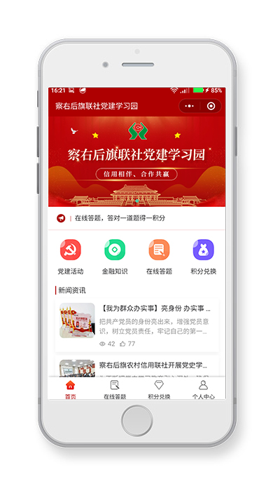 察右后旗聯(lián)社黨建學習園小程序是企業(yè)內部使用的黨建知識學習的小程序,內部員工需要先注冊,才可以進行答題得積分,積分兌換商品的功能,呼搜網絡從策劃到開發(fā)上線全程提供服務。