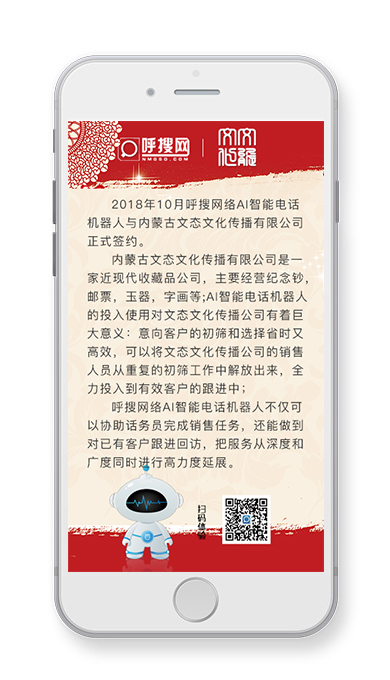 2018年10月呼搜網(wǎng)絡(luò)AI智能電話機(jī)器人與內(nèi)蒙古文態(tài)文化傳播有限公司正式簽約。