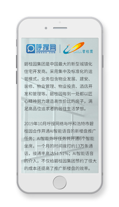 2019年10月呼搜網(wǎng)絡(luò)AI智能語音與碧桂園集團(tuán)簽約合作,AI智能語音外碧桂園集團(tuán)帶來的不僅是節(jié)約了很大的成本還大大提高了推廣新樓盤的效率。