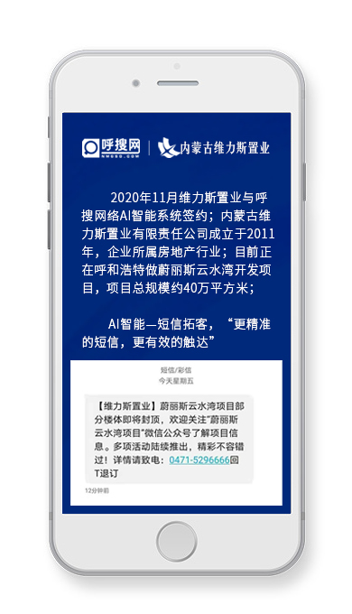 2020年11月呼搜網(wǎng)絡(luò)AI智能短信拓客與內(nèi)蒙古維力斯置業(yè)簽約合作;