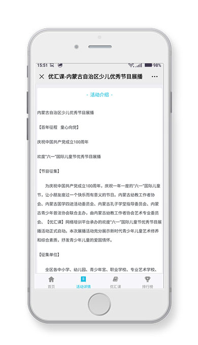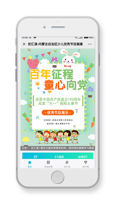 為慶祝中國(guó)共產(chǎn)黨成立100周年,慶祝一年一度的“六一”國(guó)際兒童節(jié);內(nèi)蒙古幼教工作者協(xié)會(huì)、內(nèi)蒙古國(guó)學(xué)四進(jìn)活動(dòng)委員會(huì)、內(nèi)蒙古孔子學(xué)堂指導(dǎo)委員會(huì)、內(nèi)蒙古青少年普法協(xié)會(huì)聯(lián)合主辦,由內(nèi)蒙古幼教工作者協(xié)會(huì)藝術(shù)專業(yè)委員會(huì)、【優(yōu)匯課】網(wǎng)絡(luò)培訓(xùn)平臺(tái)承辦的歡度“六一”國(guó)際兒童節(jié)優(yōu)秀節(jié)目展播活動(dòng)正式啟動(dòng)。