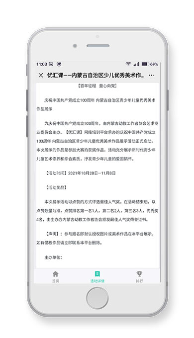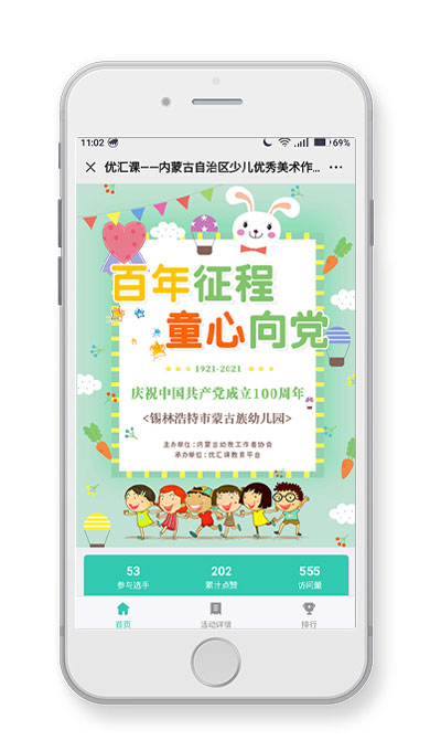 為慶祝中國(guó)共產(chǎn)黨成立100周年,由內(nèi)蒙古幼教工作者協(xié)會(huì)藝術(shù)專(zhuān)業(yè)委員會(huì)主辦、【優(yōu)匯課】網(wǎng)絡(luò)培訓(xùn)平臺(tái)承辦的慶祝中國(guó)共產(chǎn)黨成立100周年 內(nèi)蒙古自治區(qū)青少年兒童優(yōu)秀美術(shù)作品展示活動(dòng)正式啟動(dòng)。本次展示的作品是參加大賽的獲獎(jiǎng)作品,活動(dòng)充分展示新時(shí)代青少年兒童藝術(shù)修養(yǎng)和綜合素質(zhì),抒發(fā)青少年兒童的愛(ài)國(guó)情懷。